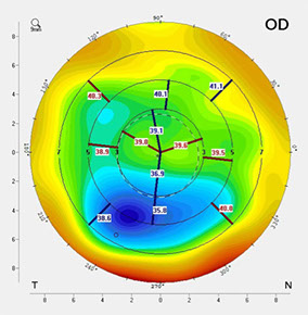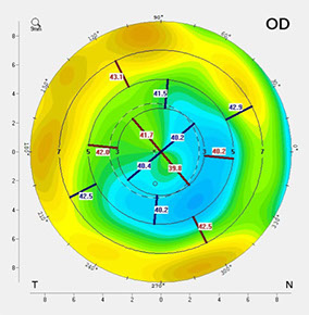 Pre-op Pentacam showed central flattening and irregular astigmatism.