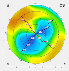 Pre-op Pentacam showed central flattening OS consistent with myopic LASIK and astigmatism.