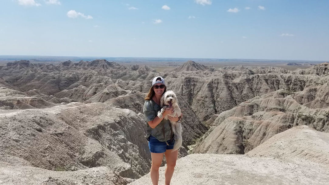 Mae is her 9-year-old mini Goldendoodle.